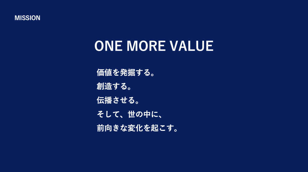 ベクトルグループのミッション「いいモノを世の中に広め、人々を幸せに」に加え、プラチナムではさらに「ONE MORE VALUE」を掲げて、クライアント・ブランドのひとつ上の価値を創り、我々の介在価値を発揮します。